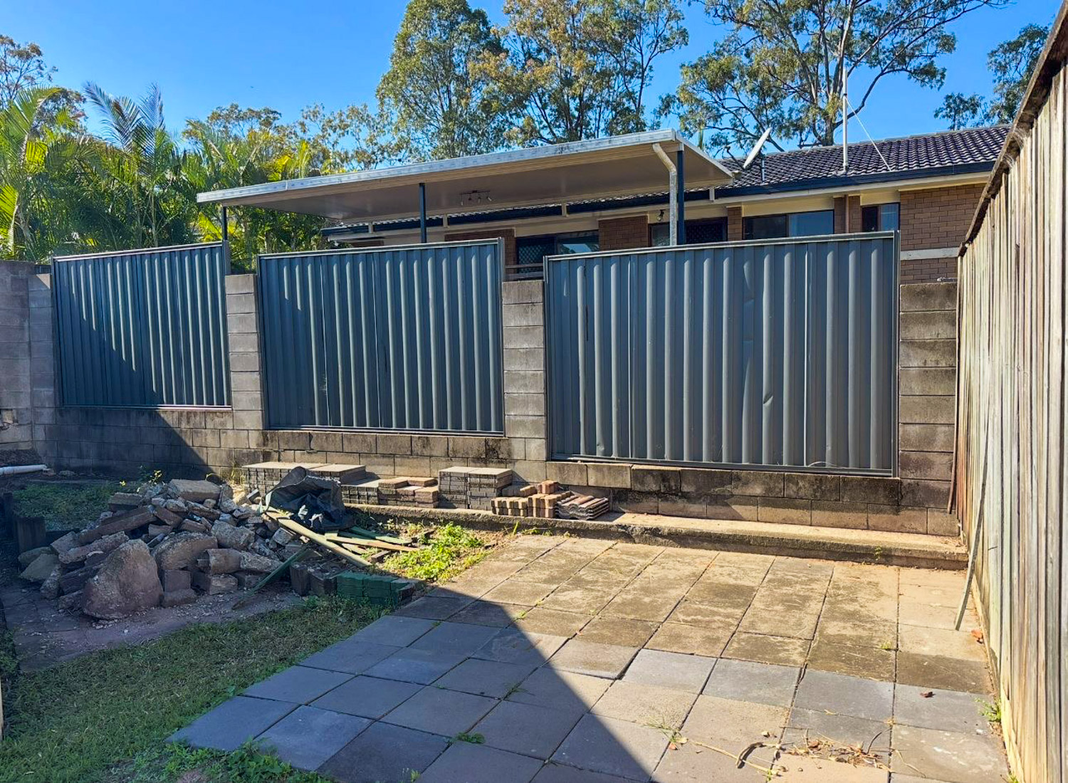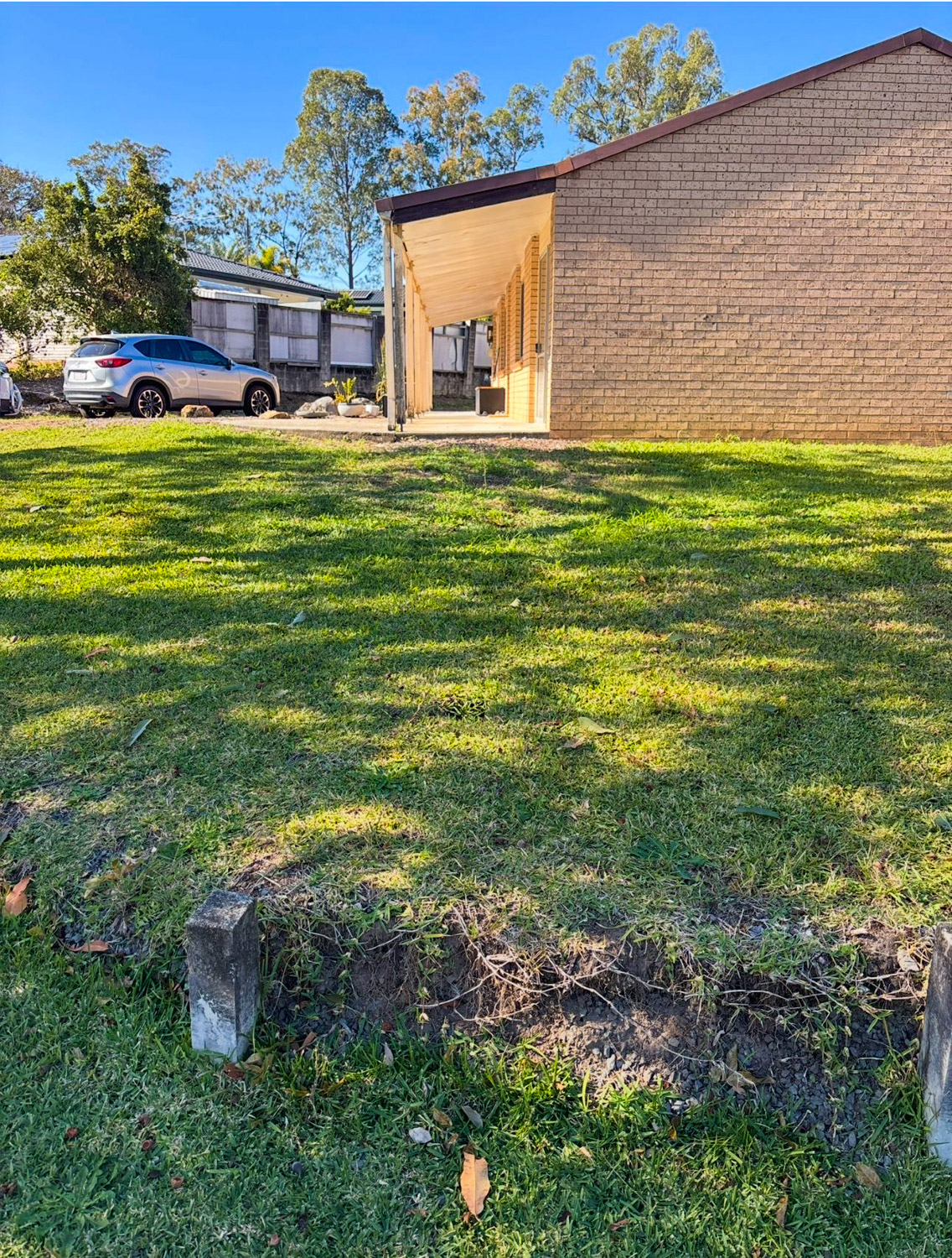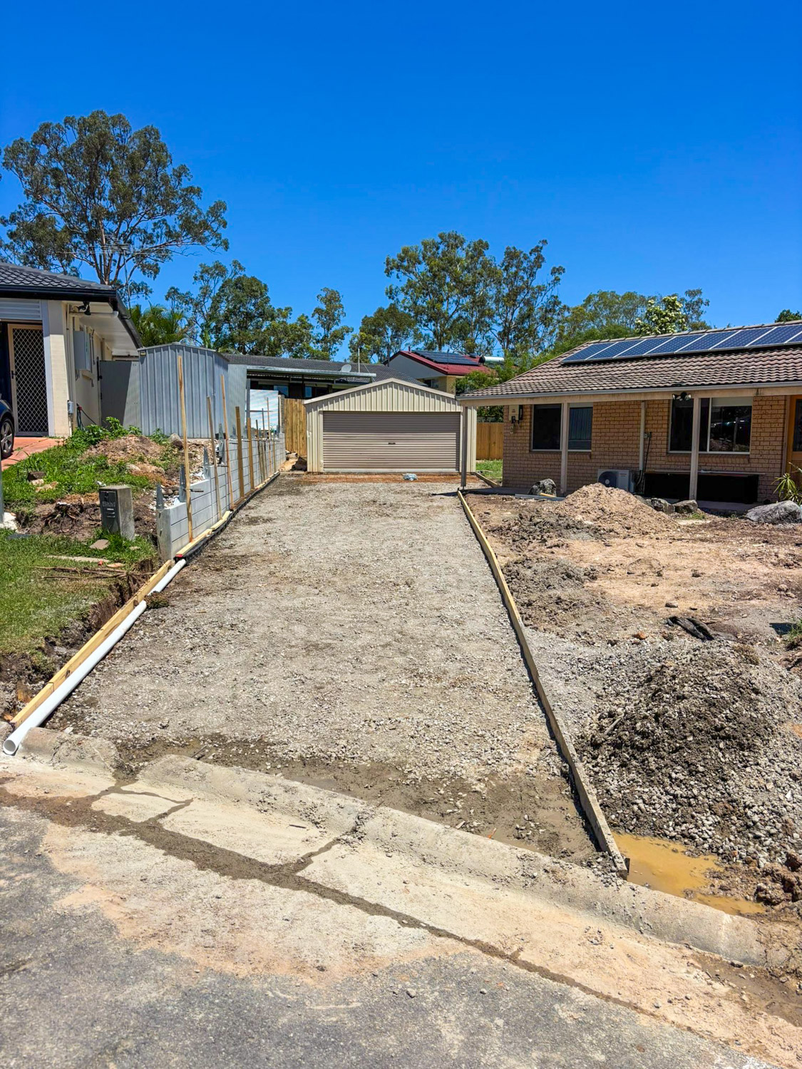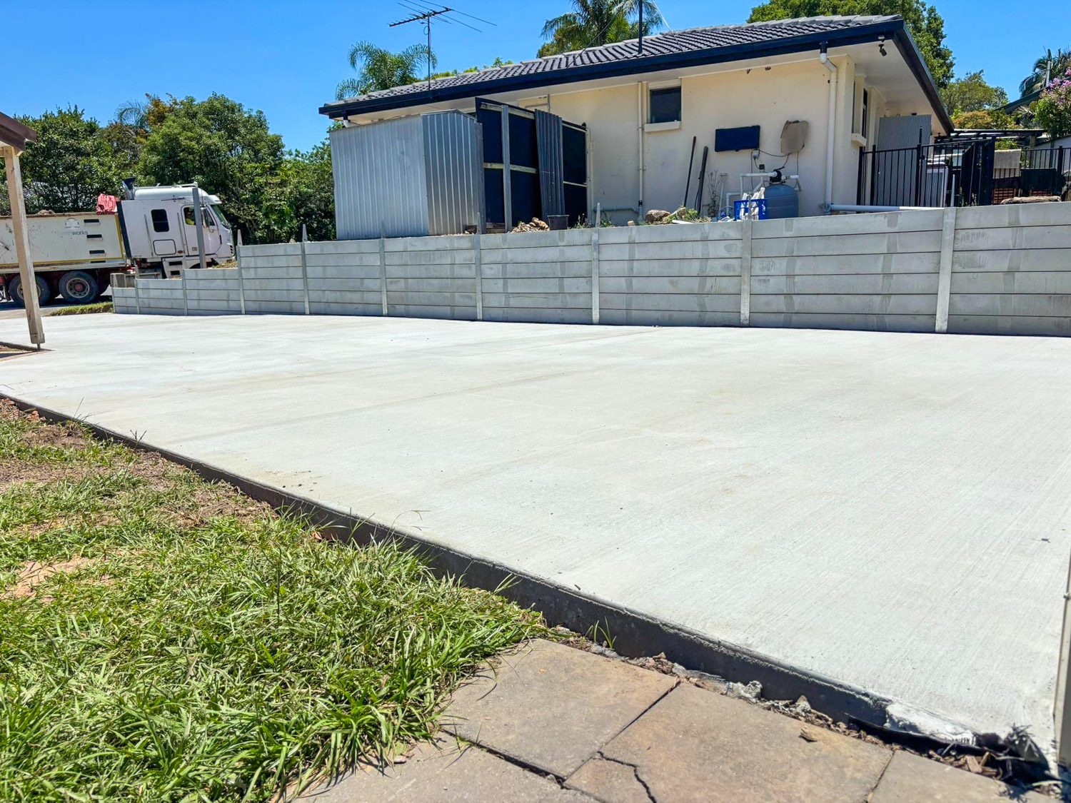 A lot of demolition work had to be done, including ripping out the old walls and fencing. They were replaced with stylish concrete sleepers, and the fencing used in the final design was a striking mix of timber along the back fence, and Colorbond alongside the driveway. The driveway itself was made to 150mm deep rather than the standard 100-120mm to better cope with multiple heavier vehicles, and was created with channel drains inserted along the edge of the wall to cope with water runoff.