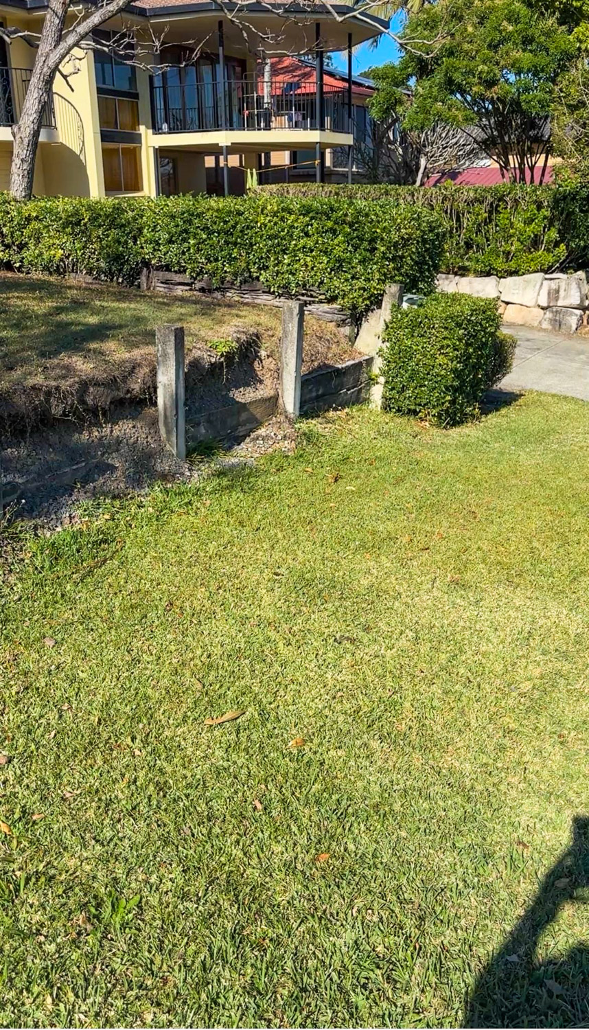 The other side of the property previously had a large lawn flowing down into a small, unfinished ledge. This was completed with a smaller retaining wall which better defined the space and gave security to passing foot traffic, and a pathway that ran down to the edge of the property to provide ingress and egress, and to make the space more usable.