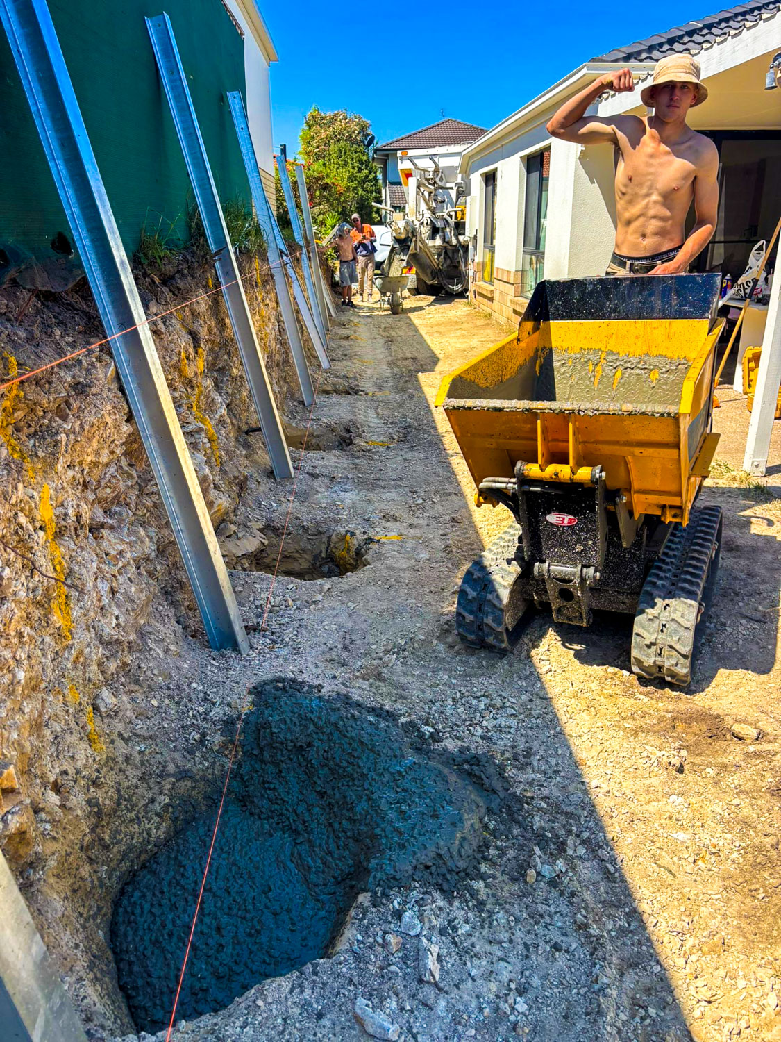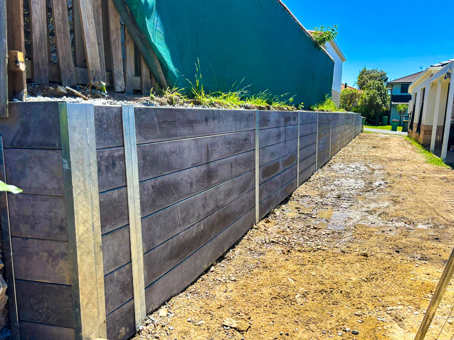 We removed the old wall which was rotting and had started leaning over the years – almost to the point of collapse. We then excavated back another two metres, giving extra length to the area as well as width. They chose a 1.2 metre tall concrete sleeper wall, and needed it engineered as it was supporting both the neighbour’s house and swimming pool on the high side of the block. M.O.S. Wall Construction worked with a certified engineer to ensure that the end result would be safe and provide years of support from all of the pressure against it.
